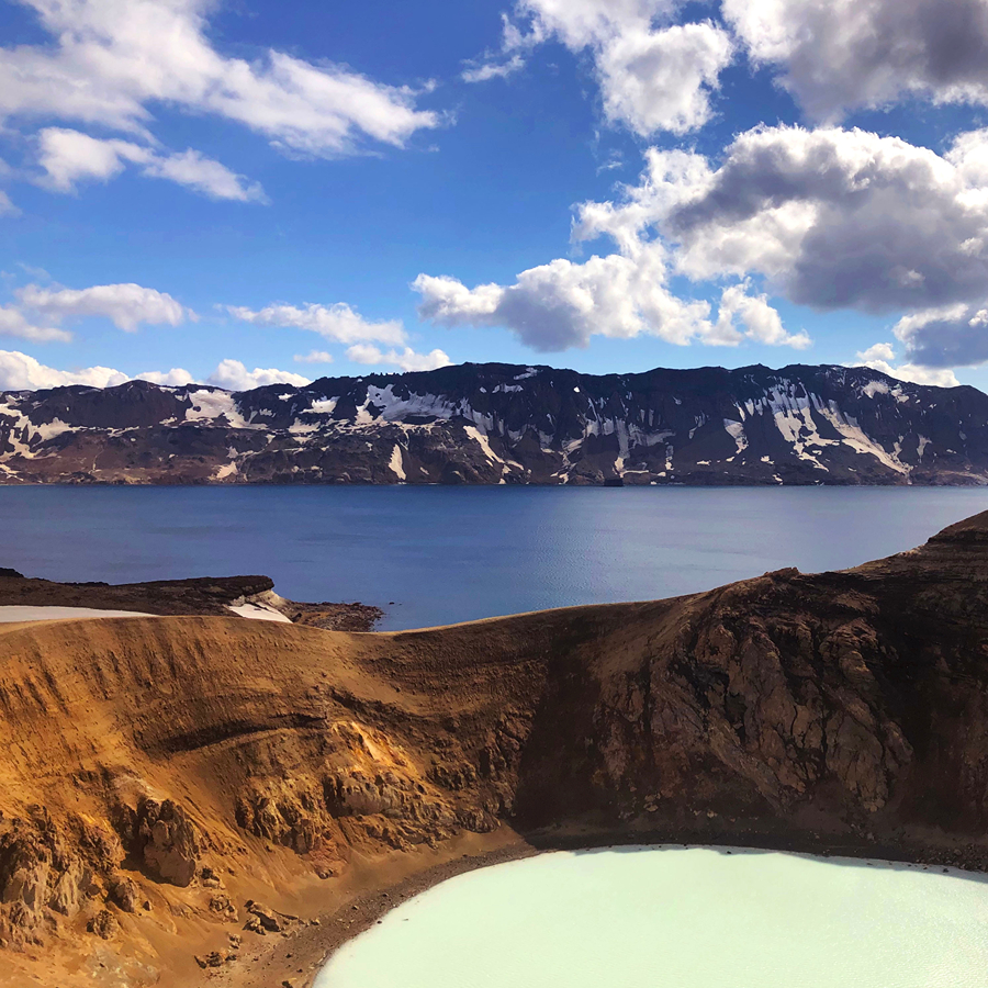 C’est un gigantesque volcan dans lequel repose les eaux de d’Öskjuvatn, le lac dans lequel se trouve la bouche de Viti, petit cratère dans lequel vous pouvez vous baigner – sous réserve. L’accès au volcan est l’occasion de faire des randonnées plus ou moins longues en été dans des paysages lunaires uniques au monde.